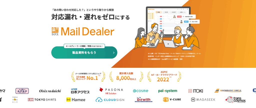 メールディーラーは、複数人でのメール対応を効率化するクラウド型メール共有・管理システムです。