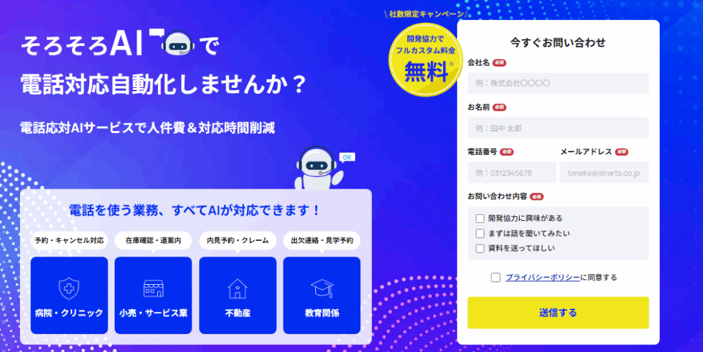 株式会社ストラーツが提供する「電話応対AIサービス」は、クラウド型コンタクトセンター構築サービスで、AI技術とCTIを融合させた高度な電話対応自動化を実現します。フルカスタマイズ対応が可能であり、各企業の業務内容や顧客ニーズに応じて、応答フローやインターフェースを柔軟に設計できます。